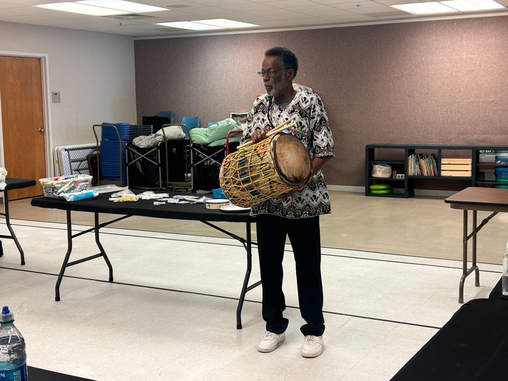 Wesley P. Phillips showed us how improvisation is used in the drumming rhythms that Black Masking Indians parade to. Participants were encouraged to come up and play the tambourine to the sound of the drum. Some of us showed off our best moves while others continued to bead to the sound of Wesley’s drum. We learned about the importance of the materials used to make the drums and the different sounds that each material provides. Participants beaded feverishly as our workshops were coming to a close. Finishing their pieces within the last meeting, participants brought in their pieces to be displayed for our showcase.