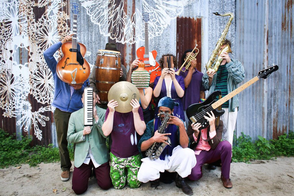 Kumasi is New Orleans’ own full Afrobeat orchestra. We fell in love with a style of music created over 50 years ago by Fela Kuti and Tony Allen, and we bring it to the people of New Orleans with live shows, as well as three recorded albums. You can expect lots of Fela Kuti tunes and some Afrofunk from ’70s Ghana and Benin in our live shows, and we play and record our original music inspired by those styles. Our original songs are primarily of protest, as well as vigilance toward change and collective growth, but composed to make people move, groove, and be inspired.